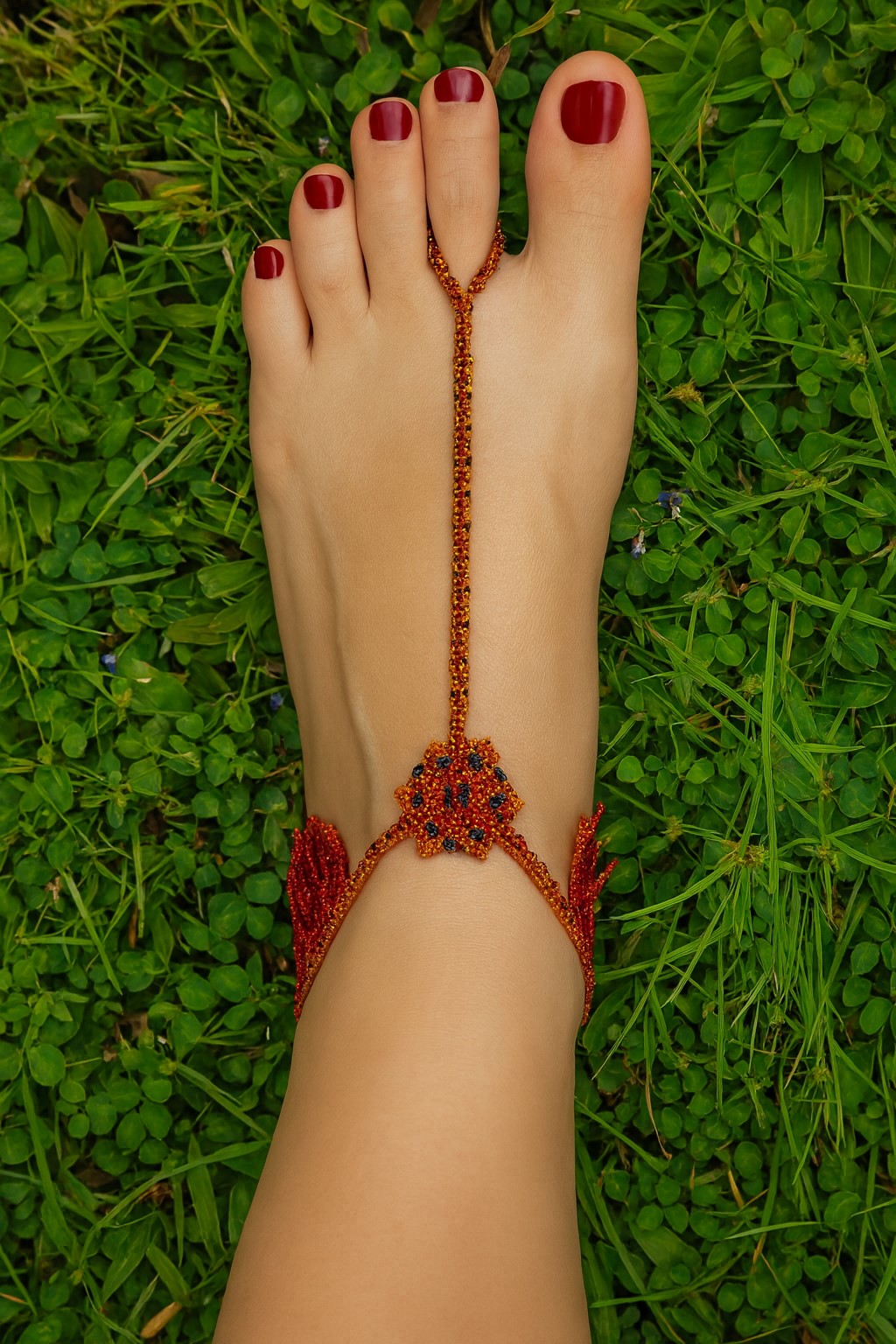 Elegante cavigliera artigianale con perline nei toni del rosso e arancione. Perfetta per la spiaggia, i festival o outfit estivi.