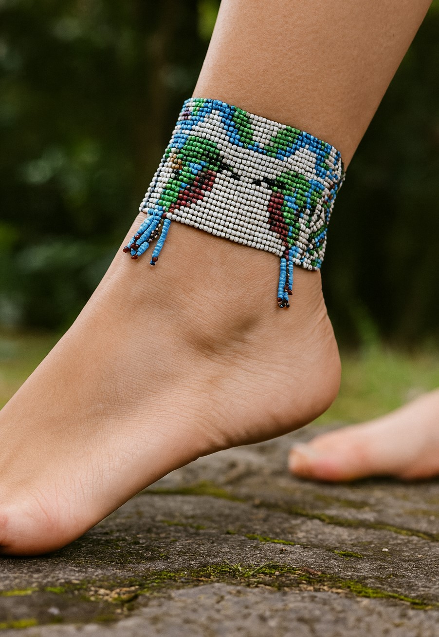De enkelband van kralen met vogelmotief is een prachtig sieraad dat perfect is voor de zomer. De enkelband is gemaakt van kleine gekleurde kralen die samen een vogelmotief vormen. Het vogelmotief is gedetailleerd en zorgt voor een speelse en vrolijke uitstraling.