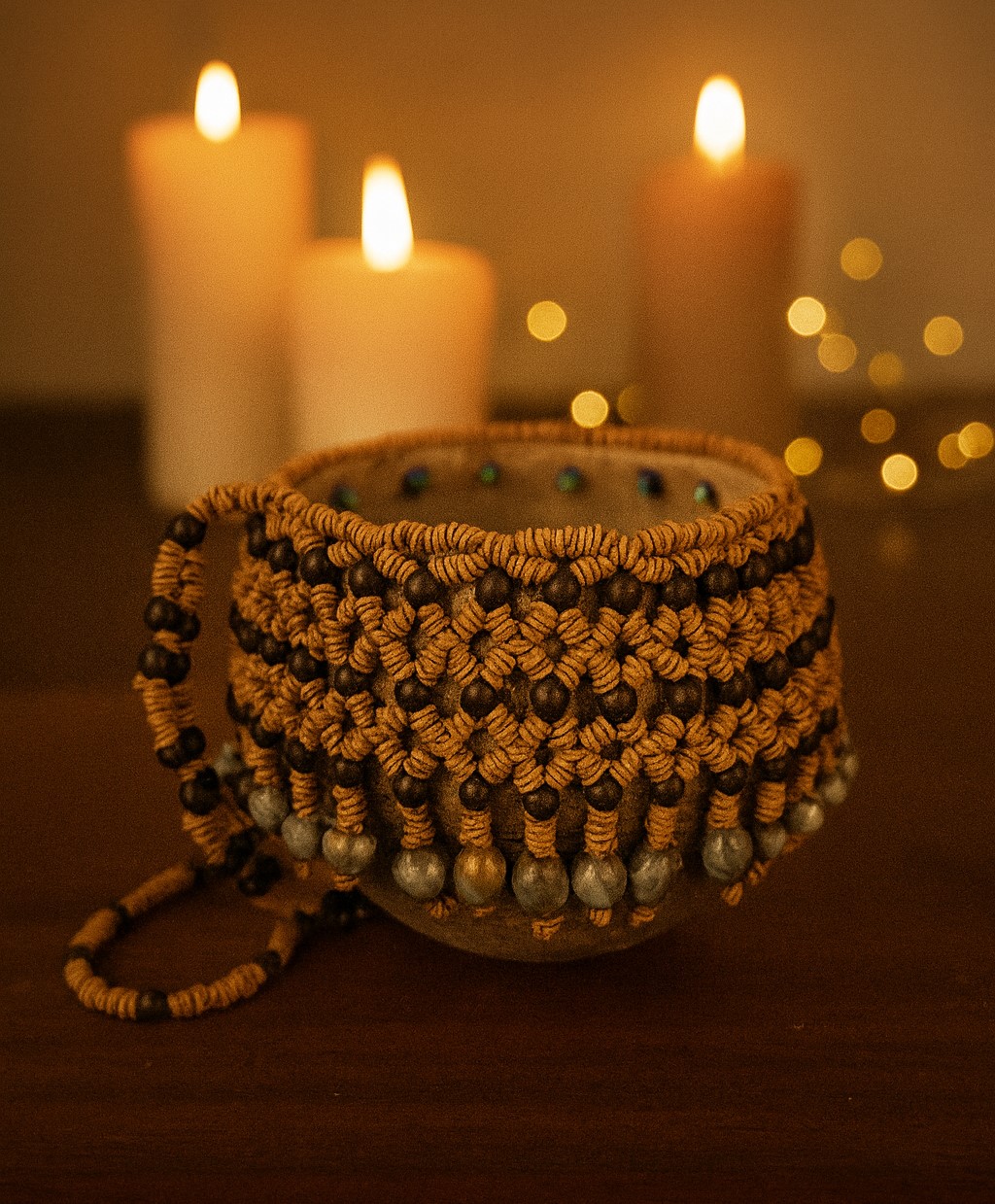 In deze kalebas komen natuur en handwerk samen. Het aardse karakter van de vrucht wordt omarmd door zorgvuldig geregen mara mara en sakisiri zaden, afgewerkt met jobstranen. Een object dat niet alleen dient als gebruiksvoorwerp, maar ook als symbool van verbondenheid tussen traditie en sfeer, tussen eenvoud en verfijning.