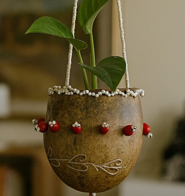 Dit kalebas hangpotje is handgemaakt en versierd met kokrikri en kralen. De kalebas heeft een unieke vorm en is perfect om kleine planten in te plaatsen. Het hangpotje is ideaal voor het creëren van een gezellige sfeer in huis of in de tuin. De kokrikri en kralen zorgen voor een speels en kleurrijk effect. Hang het potje op aan een haakje of aan een touw en geniet van de natuurlijke uitstraling die het brengt. Dit kalebas hangpotje is een echte eyecatcher en een leuke toevoeging aan je interieur of tuin.