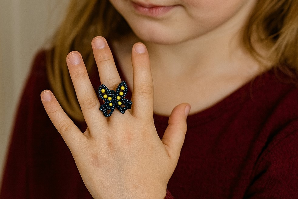 Een vlinder ring gemaakt van kralen, speciaal ontworpen voor kinderen. Het is een uniek en speels accessoire dat perfect is voor jonge meisjes die van sieraden houden.