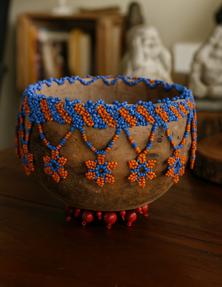 Esta tigela de cabaça é feita à mão e decorada com contas de alta qualidade. A cabaça é naturalmente resistente e durável, tornando-a perfeita para uso diário. As contas são aplicadas manualmente, conferindo à tigela um visual único e artístico. Adicione um toque de beleza natural à sua casa com esta linda tigela de cabaça.